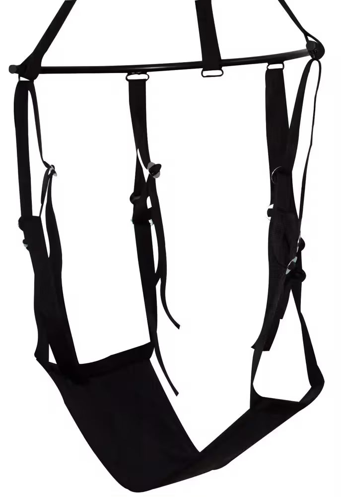 Schwarze Liebesschaukel mit breiter Stützmatte für optimalen Komfort und bessere Gewichtsverteilung.