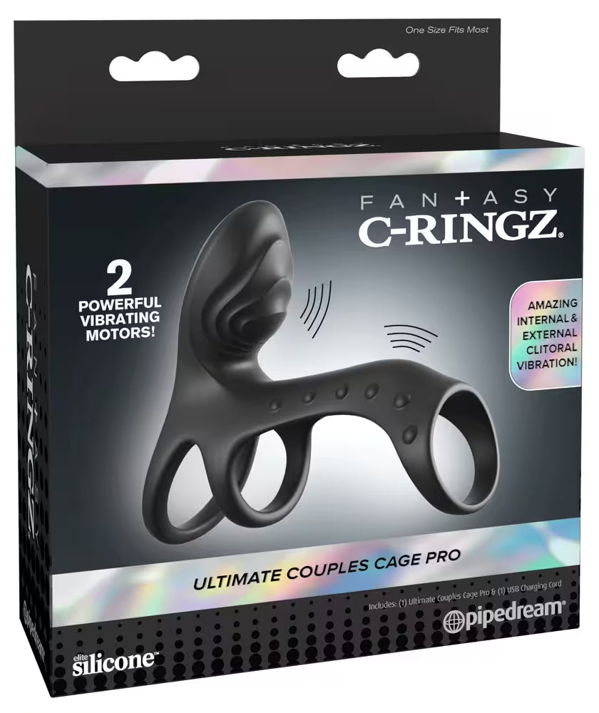 L’Ultimate Couples Cage Pro de Fantasy C-Ringz combine manchette pénienne texturée, double anneau pénien et anneau testiculaire pour un maintien ferme… et des vibrations sur deux zones ! Le moteur frontal caresse le gland tandis que le module supérieur stimule le clitoris. Résultat : érection soutenue, sensations profondes et points culminants partagés – même sous la douche.
